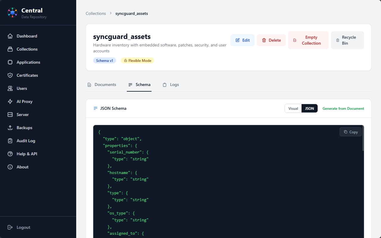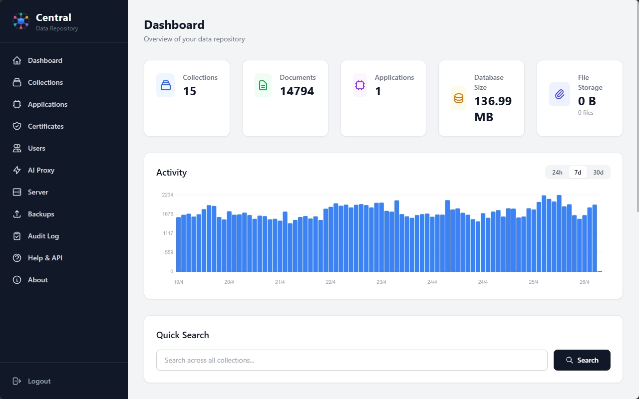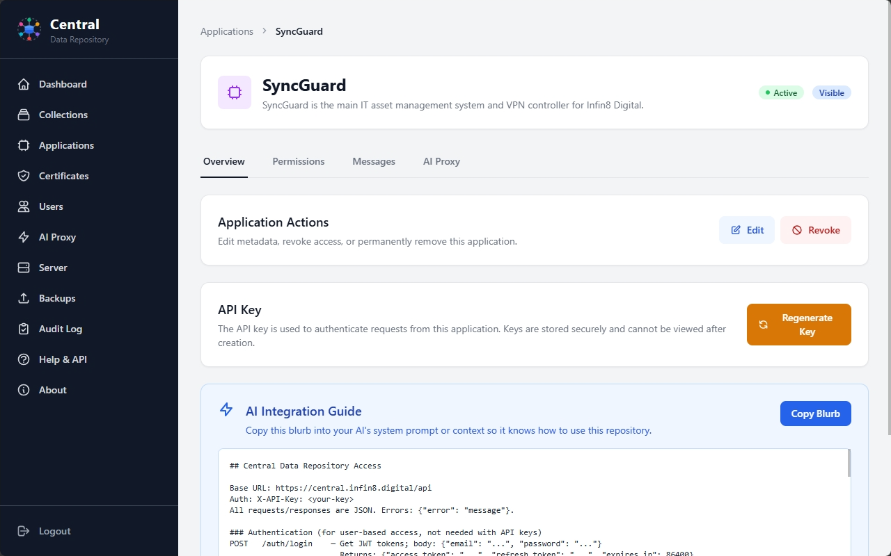 The proliferation of AI build applications risks data and access becoming fragmented across the organisation. Central provides the opportunity to support and encourage AI development by ensuring that data remains centralised, backed up and access controlled. Central also provides various other utilities including certificate authority, Google Workspace user store, and AI proxy, to make building applications using AI even easier. Central will even provide content to directly copy and paste into an LLM of choice to start building.
